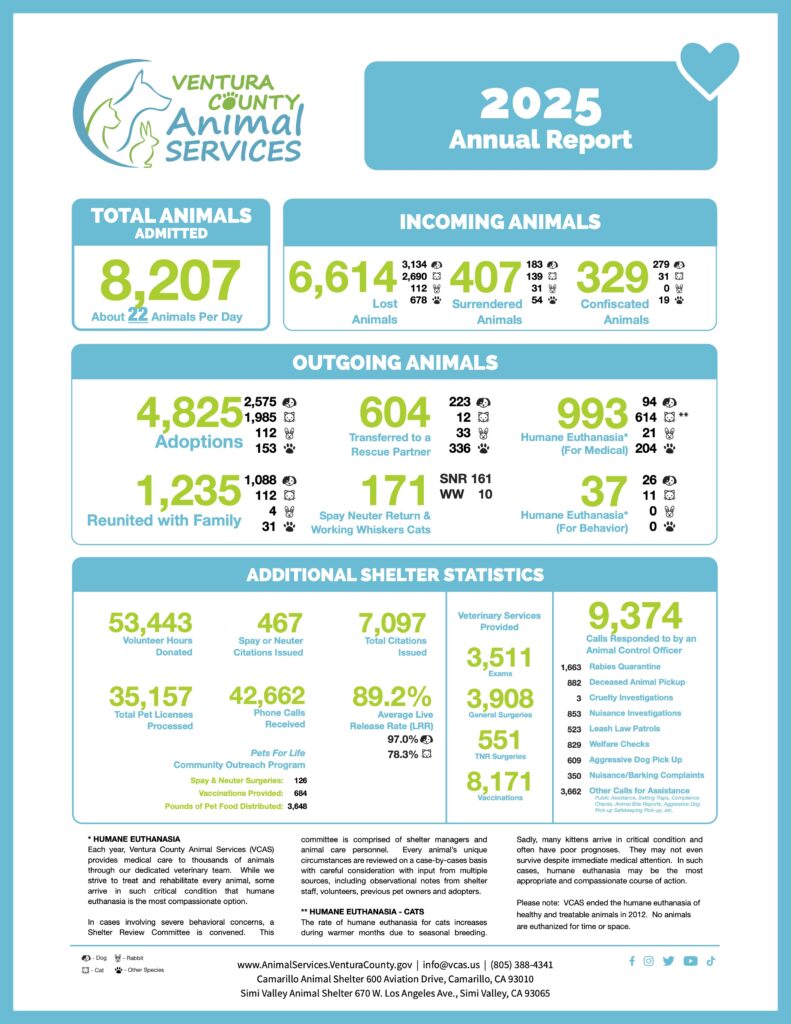 To see the people and stories behind the numbers, follow us on Facebook, Instagram, X (Twitter), or TikTok.  Better yet, join the VCAS family—volunteer, foster, or visit our shelters in Camarillo and Simi Valley to see how we make a difference each and every day.